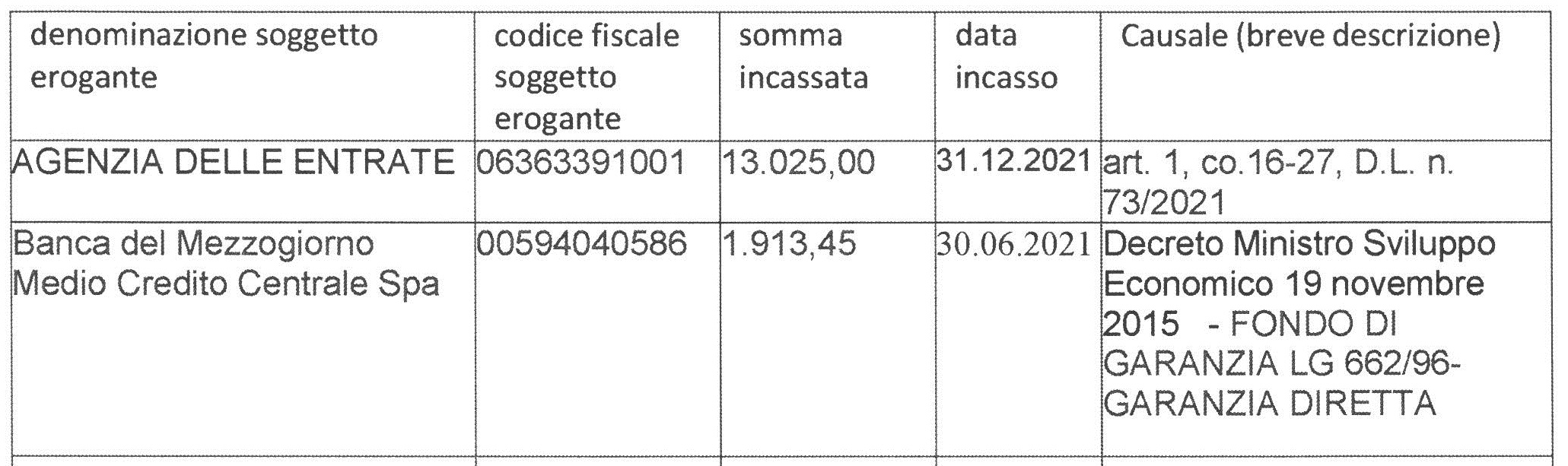Con riferimento agli obblighi di trasparenza relativi agli aiuti pubblici L 124/2017 - art. 1 com. 125-129, si pubblica la tabella dei contributi ricevuti per l'anno 2021 da parte dell'Impresa