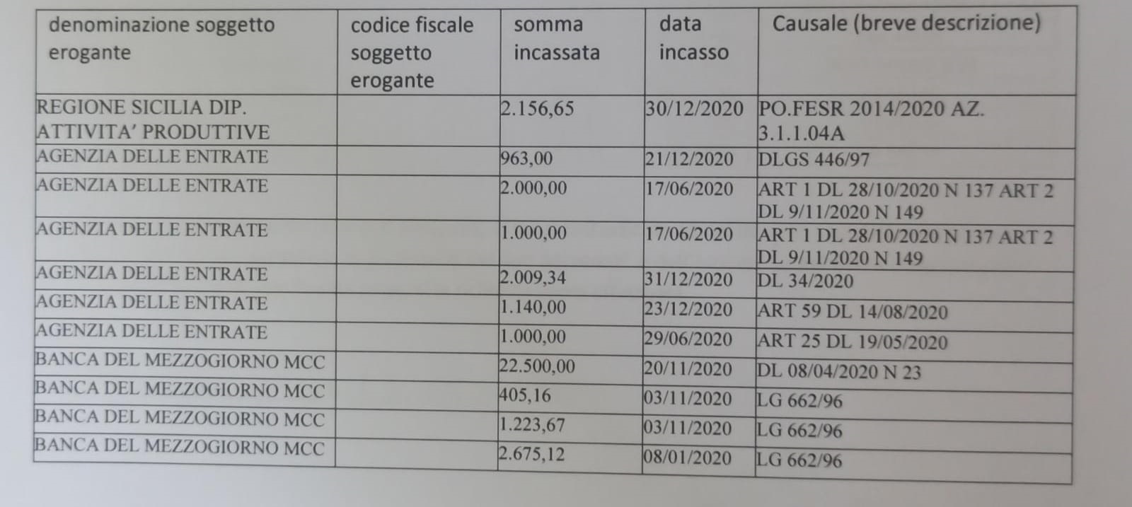 Con riferimento agli obblighi di trasparenza relativi agli aiuti pubblici L 124/2017 - art. 1 com. 125-129, si pubblica la tabella dei contributi ricevuti per l'anno 2020 da parte dell'Impresa