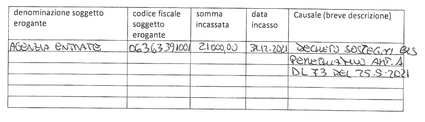 Con riferimento agli obblighi di trasparenza relativi agli aiuti pubblici L 124/2017 - art. 1 com. 125-129, si pubblica la tabella dei contributi ricevuti per l'anno 2021 da parte dell'Impresa SENERGIA S.R.L. con CF 01439190883